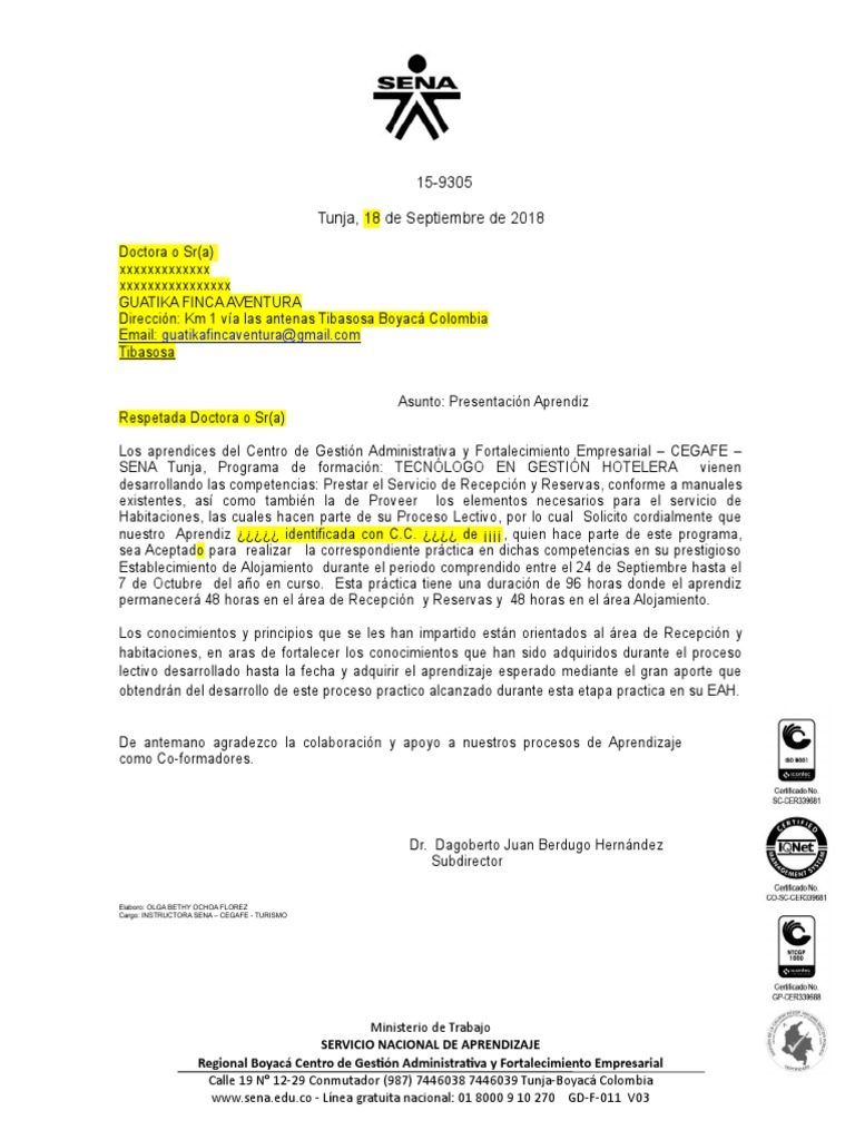 Modelo carta de presentacion aprendiz sena. De Centro de Formacin en el mismo programa en el que est matriculado o en otro programa a fn tecnolgicamente en el que se haya aplicado la misma prueba de seleccin en el proceso de ingreso. Servicio Nacional de Aprendizaje SENA - Direccin General Calle 57 No. En la anterior imagen se encuentran detallados cada uno de los datos que tendrs que incluir para que el SENA acepte tu solicitud de retiro voluntario.